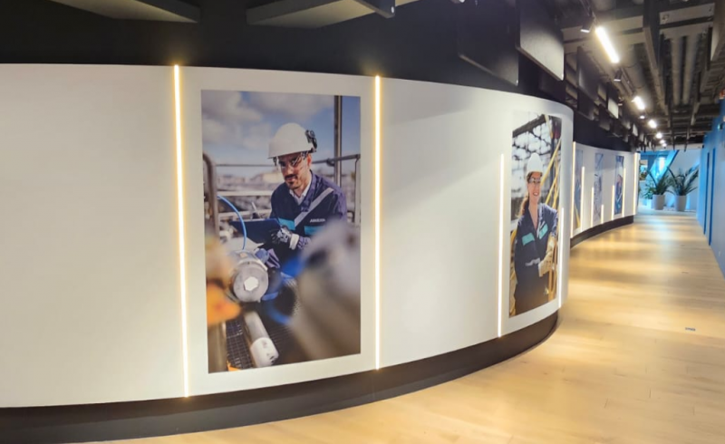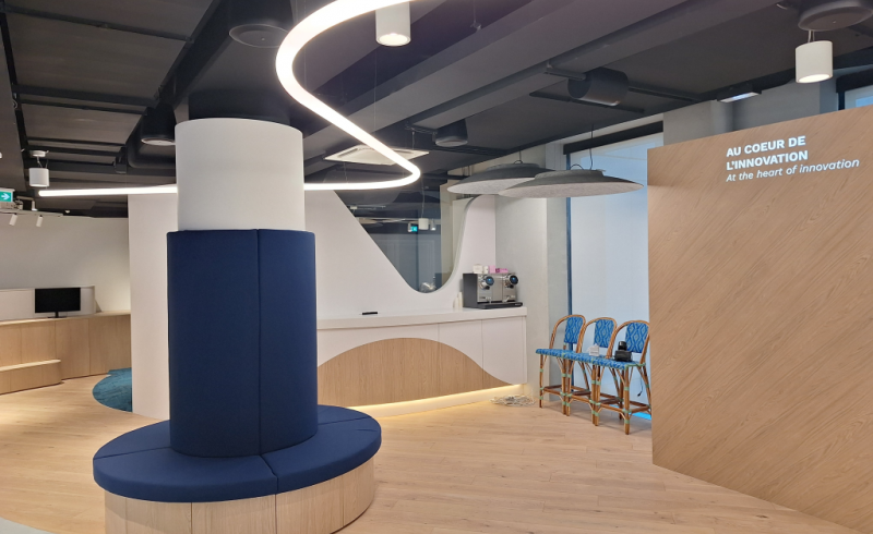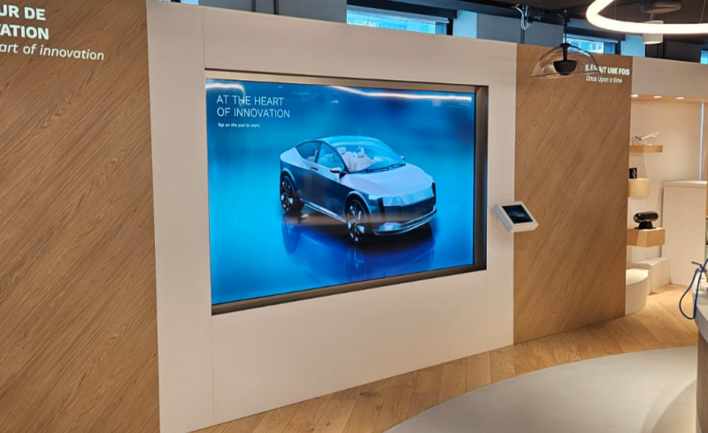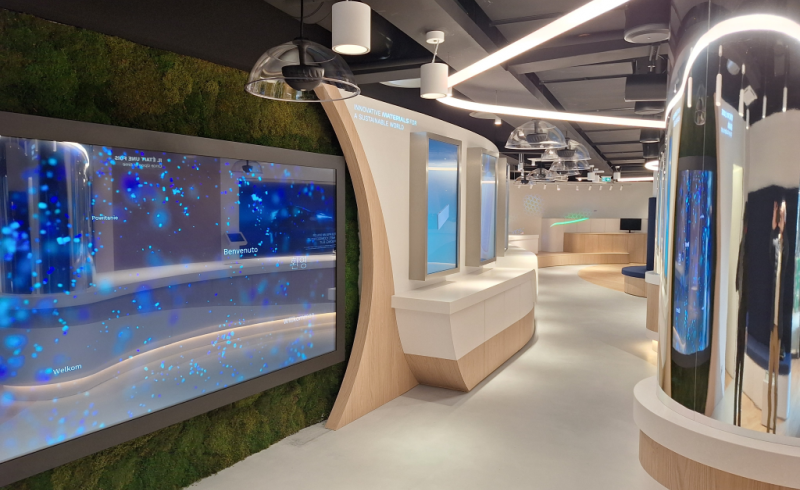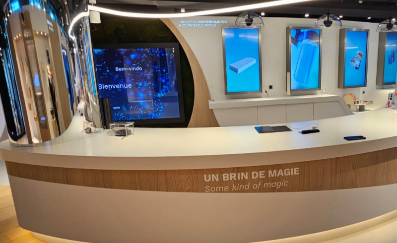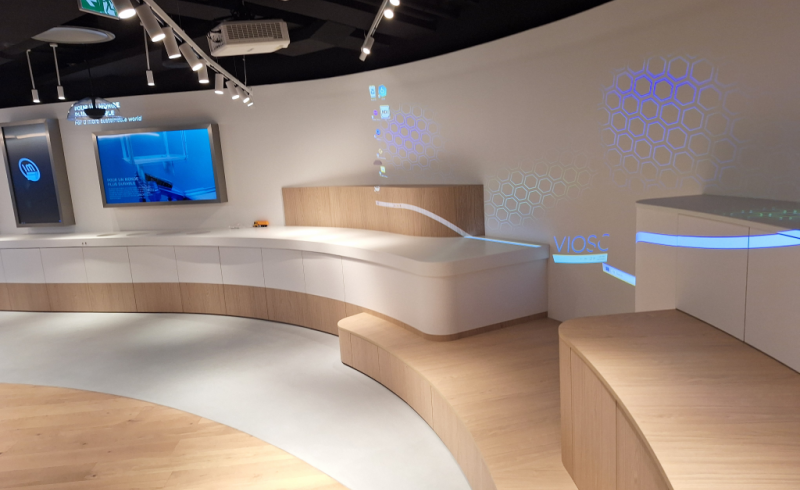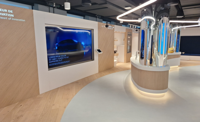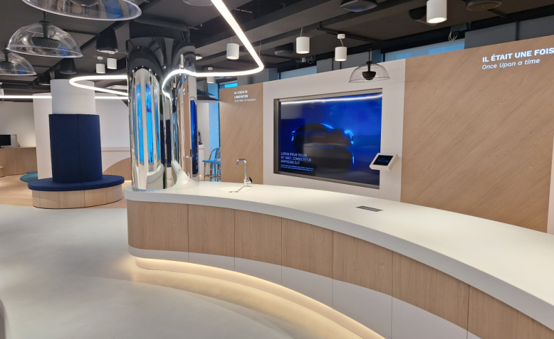 The Innovation Zone is structured around a central totem equipped with a Priva-Light screen—acting as the interactive heart of the visitor’s experience. Adjacent to it, a product-presentation alcove was developed with sliding back panels, enabling the space to adapt depending on content needs and mediation scenarios.
