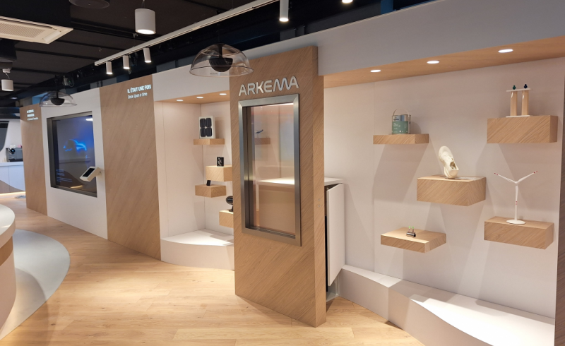 The product display unit, also crafted with curved geometry, combines a Corian top with a two-tone laminated structure. Its shape and premium detailing make it both a technical piece and a visually expressive element designed to highlight ARKEMA materials.