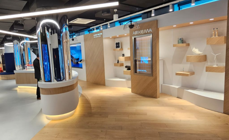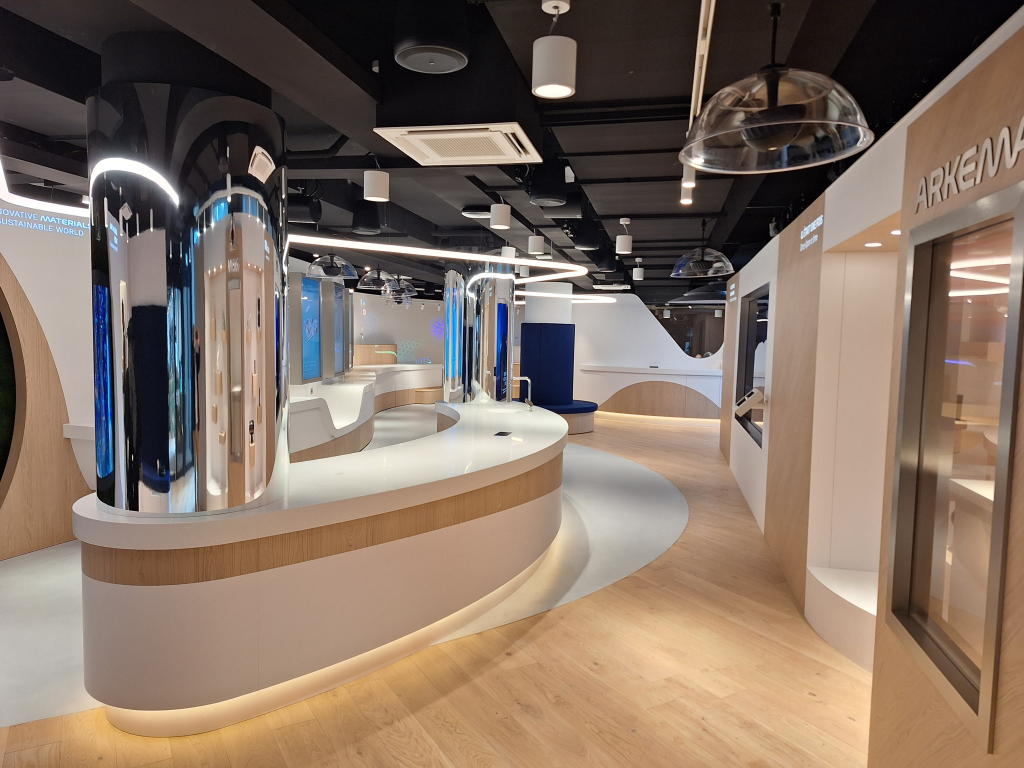Le meuble support produit, lui aussi façonné en forme courbes, combine un dessus en Corian avec un habillage en stratifié bicolore. Sa géométrie et ses finitions en font un élément à la fois technique et visuellement expressif, conçu pour mettre en avant les matériaux ARKEMA.