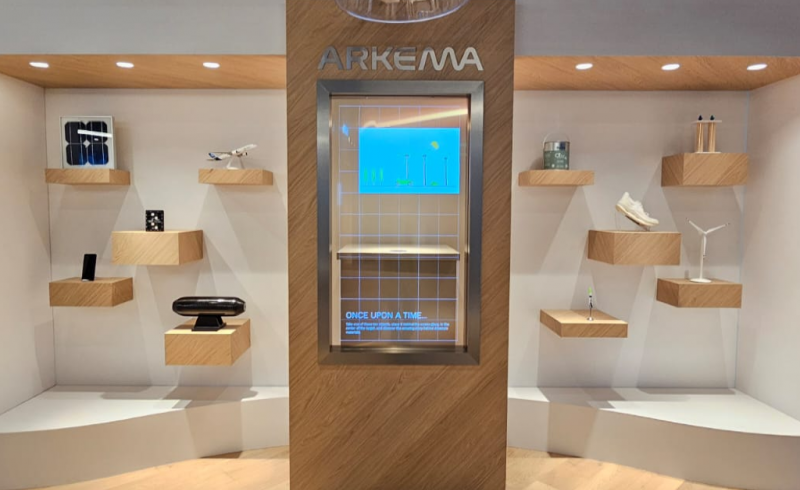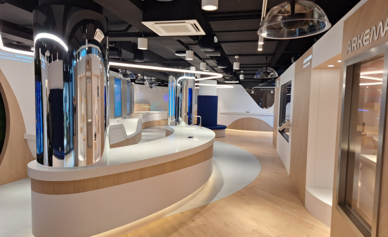 The product display unit, also crafted with curved geometry, combines a Corian top with a two-tone laminated structure. Its shape and premium detailing make it both a technical piece and a visually expressive element designed to highlight ARKEMA materials.