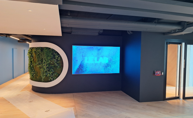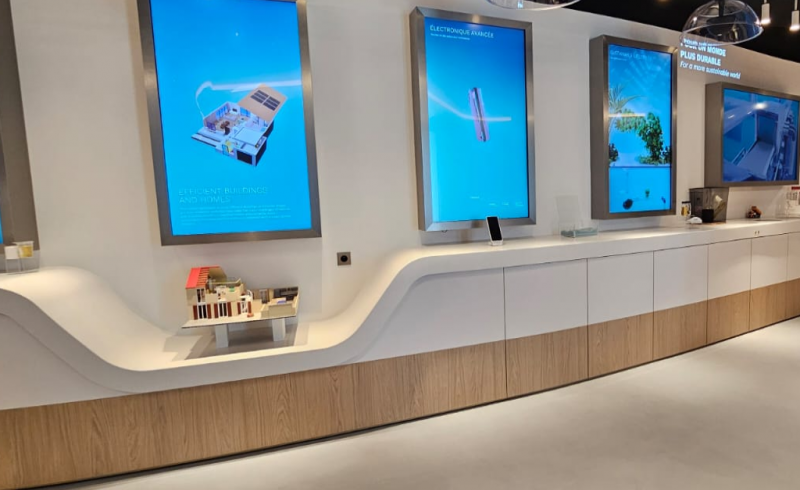 The Innovation Zone is structured around a central totem equipped with a Priva-Light screen—acting as the interactive heart of the visitor’s experience. Adjacent to it, a product-presentation alcove was developed with sliding back panels, enabling the space to adapt depending on content needs and mediation scenarios.