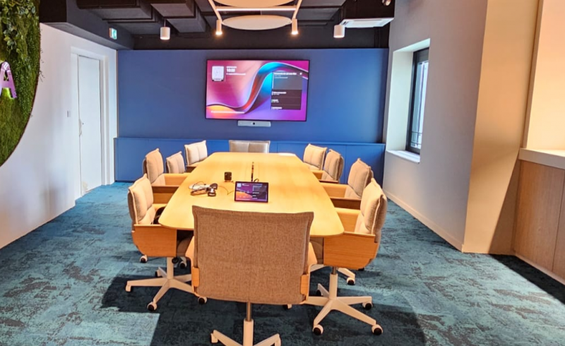 Additional components complete the overall layout, including the meeting room with integrated cabinetry and a planted feature, a curved bench with built-in storage and phone chargers, and the entrance corridor cladding made of backlit white panels accented with vegetation.